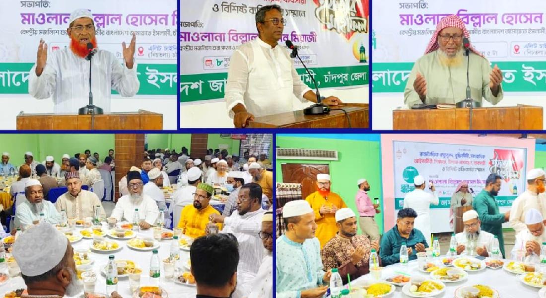 বাংলাদেশ জামায়াতে ইসলামী চাঁদপুর জেলা শাখার উদ্যোগে রাজনৈতিক নেতৃবৃন্দ, বুদ্ধিজীবী, সাংবাদিক, আইনজীবী, শিক্ষক, ওলামা-মাশায়েখ, ব্যবসায়ী ও বিশিষ্ট ব্যক্তিবর্গের সম্মানে দোয়া ও ইফতার মাহফিল অনুষ্ঠিত হয়েছে।