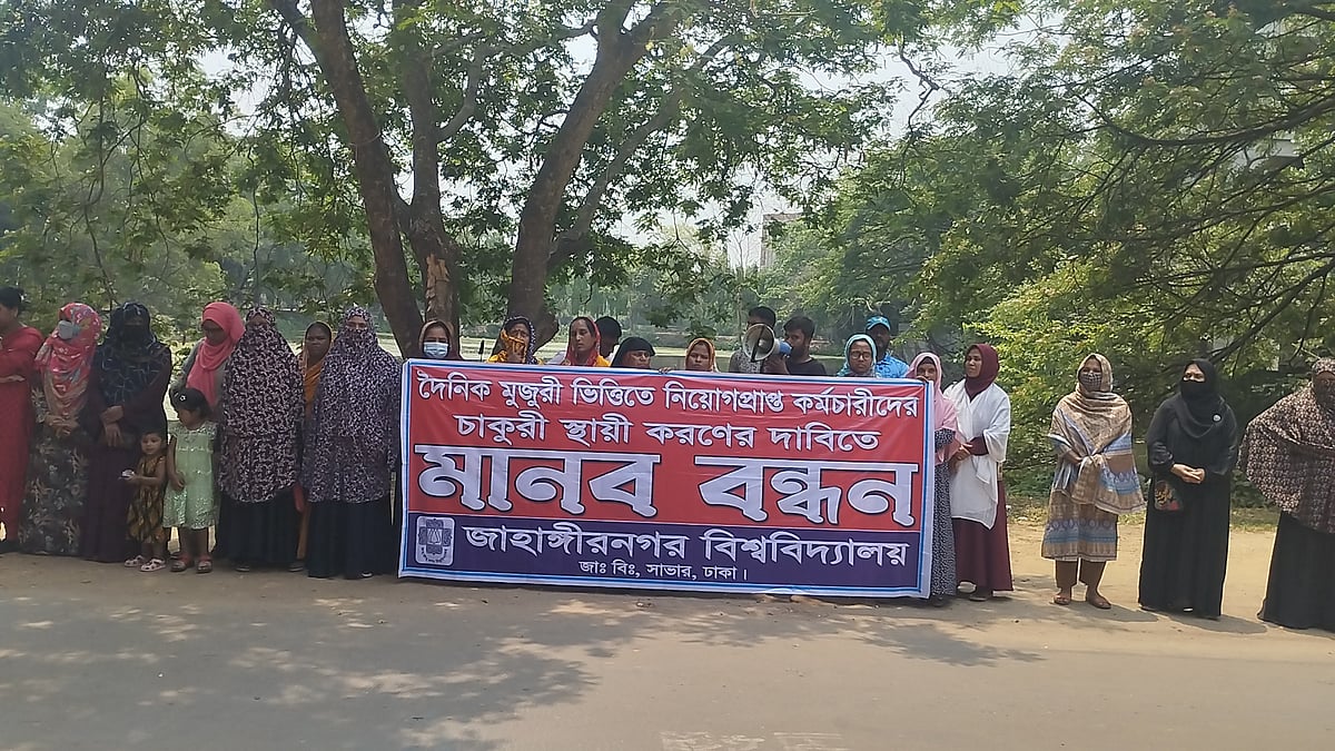 জাহাঙ্গীরনগরে দৈনিক মজুরিভিত্তিক কর্মচারীদের চাকরি স্থায়ীকরণের দাবিতে মানববন্ধন