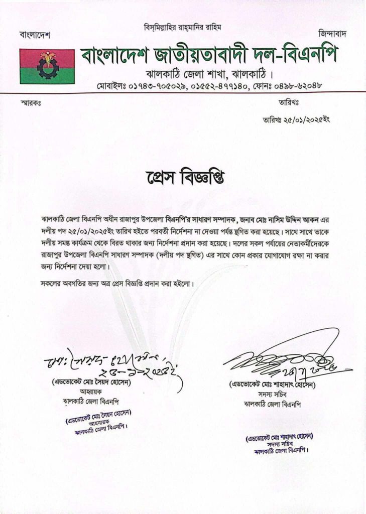 এই বিজ্ঞপ্তিতে উল্লেখ করা হয়েছে, ঝালকাঠির রাজাপুর উপজেলা বিএনপির সাধারণ সম্পাদক নাসিম উদ্দিন আকনের দলীয় পদ ২৫ জানুয়ারি থেকে পরবর্তী নির্দেশনা না দেওয়া পর্যন্ত স্থগিত করা হয়েছে। তাকে দলীয় কার্যক্রম থেকে বিরত থাকার নির্দেশনা দেওয়া হয়েছে। দলের সকল পর্যায়ের নেতাকর্মীদেরকে নাসিম উদ্দিন আকনের সঙ্গে কোনো প্রকার যোগাযোগ না করার নির্দেশনা দেওয়া হলো।