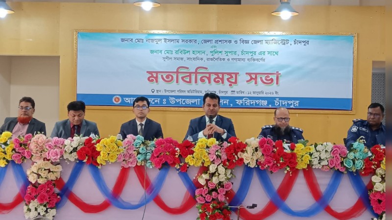 আসন্ন জাতীয় সংসদ নির্বাচন ও গণভোটকে সামনে রেখে চাঁদপুরের ফরিদগঞ্জে সুশীল সমাজ, সাংবাদিক ও রাজনৈতিক ব্যক্তিবর্গের সঙ্গে মতবিনিময় সভা করেছেন চাঁদপুর জেলা প্রশাসক ও রিটার্নিং কর্মকর্তা মো. নাজমুল ইসলাম সরকার এবং পুলিশ সুপার মো. রবিউল হাসান।