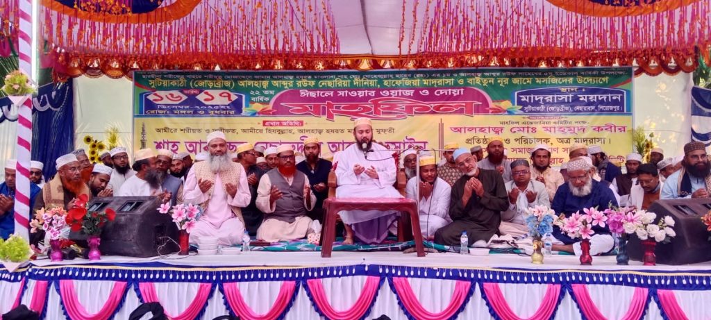 আজ ১৭ ডিসেম্বর, রোজ বুধবার, বাদ জোহর পিরোজপুরের নেছারাবাদ উপজেলাধীন সুটিয়াকাঠী জোড়াব্রিজস্থ আলহাজ্ব আব্দুর রঊফ নেছারিয়া দীনিয়া-হাফেজিয়া ও বাইতুন নূর জামে মসজিদের উদ্যোগে আয়োজিত ঈছালে সাওয়াব দোয়া মাহফিলে প্রধান অতিথির আলোচনায় হযরত পীর সাহেব কেবলা এসব কথা বলেন।