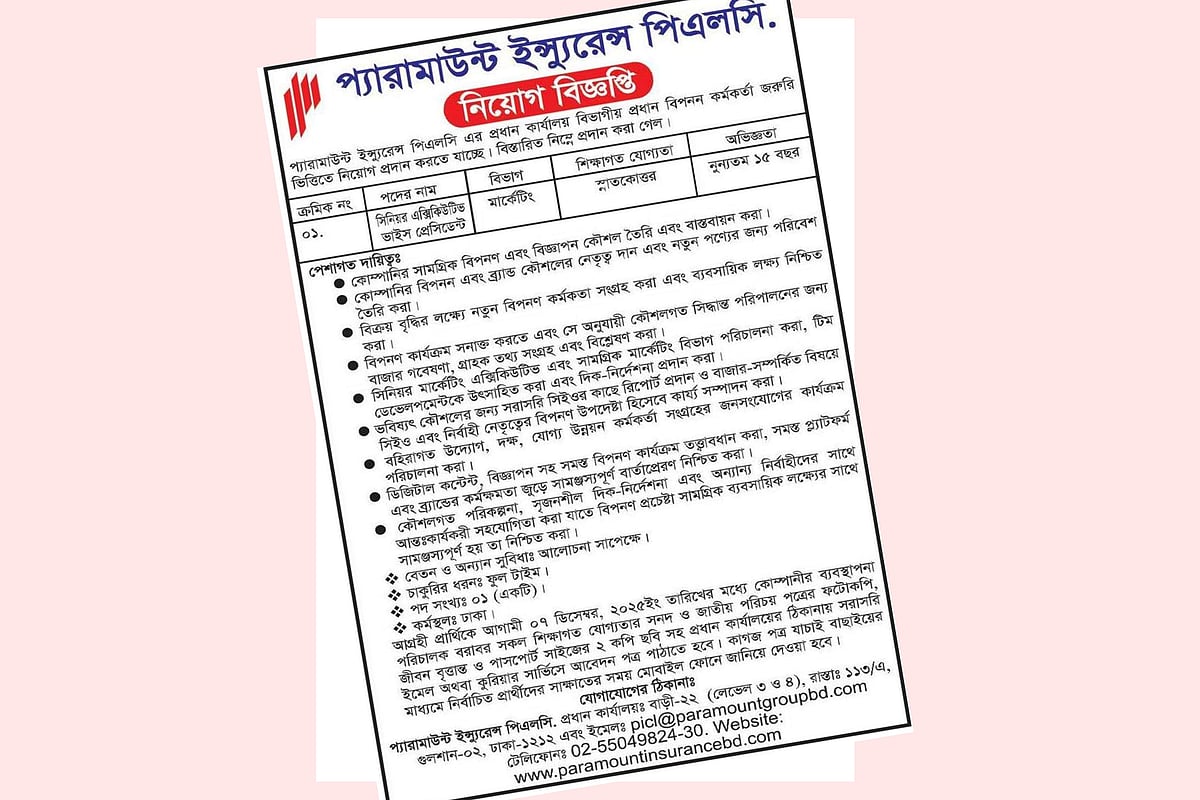 পদের নাম: সিনিয়র এক্সিকিউটিভ ভাইস প্রেসিডেন্ট