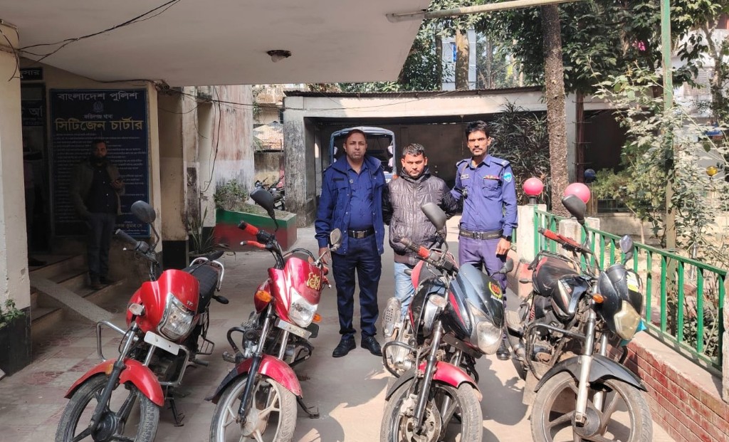 গ্রেপ্তারের সময় তার হেফাজত থেকে Redion TVS 110cc, Pulsar 150cc, Zaara 100cc এবং Platina 100cc—মোট চারটি চোরাইকৃত মোটরসাইকেল উদ্ধার করা হয়।