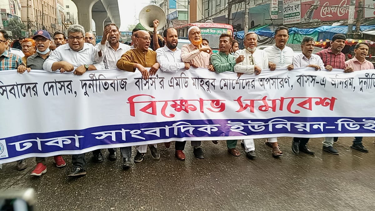 সভা শেষে একটি বিক্ষোভ মিছিল পল্টন মোড় তোপখানা রোড হয়ে জাতীয় প্রেসক্লাবে এসে শেষ হয়। সভায় মাহবুব মোর্শেদকে দুর্নীতিবাজ ও ফ্যাসিবাদের দোসর অভিহিত করে সাংবাদিক নেতারা বলেন, তাঁর স্বেচ্ছাচারিতা, অনিয়ম শেখ হাসিনার ফ্যাসিবাদী আমলকেও হার মানিয়েছে। তাঁরা আরও বলেন, বাসস এমডির বিগত ছয় মাসের কর্মকাণ্ড বর্তমান সরকারকে দারুণভাবে প্রশ্নবিদ্ধ করেছে।