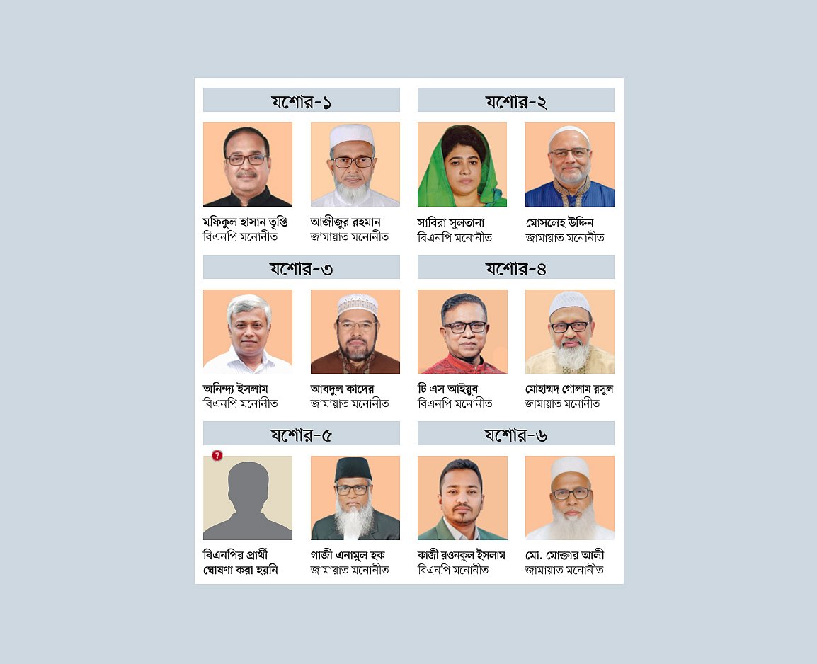এ আসনে বিএনপির প্রার্থী হিসেবে গণসংযোগ করছেন দলের সাবেক দপ্তর সম্পাদক মফিকুল হাসান (তৃপ্তি)। যদিও শার্শার কয়েকটি ইউনিয়নের একাংশের নেতারা প্রার্থী বদলের জন্য কেন্দ্রে লিখিত আবেদন করেছেন। শার্শা উপজেলা বিএনপির সভাপতি মো. হাসান জহির, সাধারণ সম্পাদক নুরুজ্জামান লিটন ও সাবেক সভাপতি খাইরুজ্জামান এ আসনে দলীয় মনোনয়নপ্রত্যাশী।