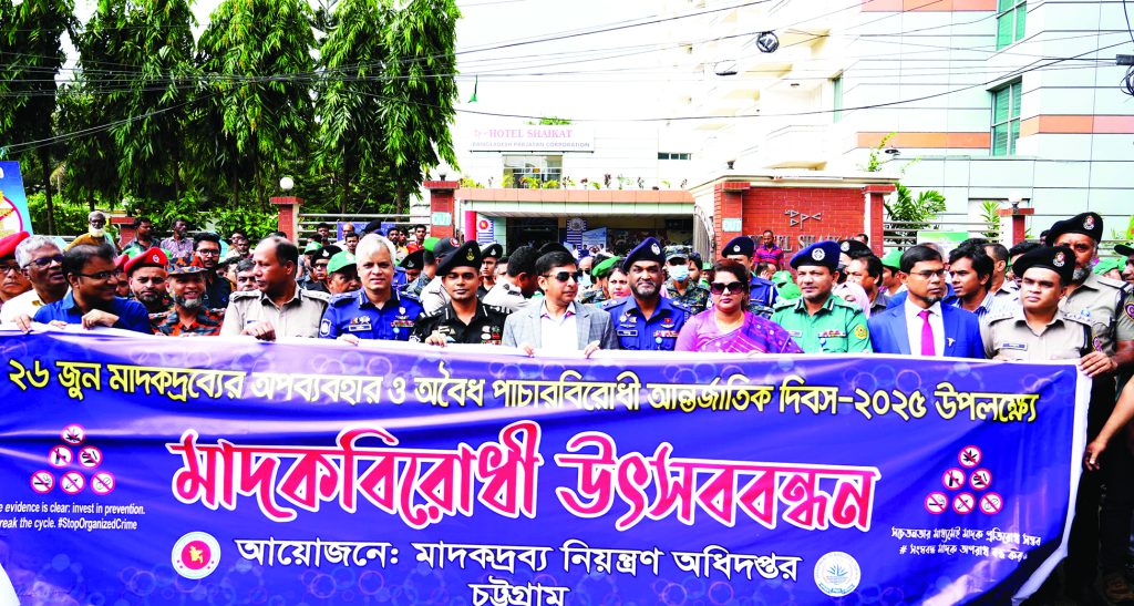 সুস্থ, সুন্দর ও মাদকমুক্ত বাংলাদেশ গড়ে তোলার জন্য সবাইকে মাদকের বিরুদ্ধে সোচ্চার হওয়ার আহ্বান জানিয়েছেন চট্টগ্রাম বিভাগীয় কমিশনার ড. মো. জিয়াউদ্দীন। গতকাল বৃহস্পতিবার দুপুরে ‘মাদকদ্রব্যের অপব্যবহার ও অবৈধ পাচারবিরোধী আন্তর্জাতিক দিবস’ উপলক্ষে চট্টগ্রাম নগরের হোটেল সৈকতে আয়োজিত আলোচনা সভায় প্রধান অতিথির বক্তব্যে এ আহ্বান জানান তিনি। বিভাগীয় কমিশনার বলেন, আজকের অনুষ্ঠানে উপস্থিতি সকলে মাদকের বিরুদ্ধে যোদ্ধা। আরও একটি গোষ্ঠী রয়েছে যারা আমাদের শত্রু। ওই গোষ্ঠীর বিরুদ্ধে আমাদের দায়িত্বকে সবার সামনে তুলে ধরতেই আজকের এই আয়োজন। তিনি আরো বলেন, মাদক নির্মূলে শুধু মাদকদ্রব্য নিয়ন্ত্রণ অধিদপ্তরের প্রচেষ্টাই যথেষ্ট নয়। সবার সম্মিলিত প্রচেষ্টা প্রয়োজন। দিবসটি উদযাপন উপলক্ষ্যে হোটেল সৈকতে চট্টগ্রাম জেলা প্রশাসক ফরিদা খানমের সভাপতিত্বে আলোচনা সভা ও পুরস্কার বিতরণী অনুষ্ঠান অনুষ্ঠিত হয়েছে। বিশেষ অতিথি ছিলেন চট্টগ্রামের অতিরিক্ত পুলিশ কমিশনার হোসাইন মোহাম্মদ কবীর ভূইয়া, চট্টগ্রাম রেঞ্জের অতিরিক্ত ডিআইজি ওয়াহিদুল হক চৌধুরী, চট্টগ্রাম বিভাগীয় মাদকদ্রব্য নিয়ন্ত্রণ অধিদপ্তরের অতিরিক্ত পরিচালক মো. জাহিদ হোসেন মোল্লা, চট্টগাম জেলা পুলিশ সুপার মো. সাইফুল ইসলাম সানতু, চট্টগ্রাম জেলা সিভিল সার্জন ডা. জাহাঙ্গীর আলম, এবং র্যাব–৭ এর অধিনায়ক লেফটেন্যান্ট কর্নেল মো. হাফিজুর রহমান। সভাপতি জেলা প্রশাসক ফরিদা খানম, মাদককে না বলার মাধ্যমে সুখী সমৃদ্ধ জীবন গড়ার আহ্বান জানান। চট্টগ্রাম বিভাগীয় মাদকদ্রব্য নিয়ন্ত্রণ অধিদপ্তরের অতিরিক্ত পরিচালক মো. জাহিদ হোসেন মোল্লা বলেন, ১৯৮৭ সালে জাতিসংঘের সাধারণ পরিষদের ৪৭তম অধিবেশনে ‘মাদকদ্রব্যের অপব্যবহার ও অবৈধ পাচারবিরোধী আন্তর্জাতিক দিবস’ হিসেবে পালনের সিদ্ধান্ত গৃহীত হয়। মাদকের অপব্যবহার রোধে সচেতনতা সৃষ্টির লক্ষ্যে সারা বিশ্বের মত বাংলাদেশেও এই দিবসটি পালিত হয়ে আসছে। বর্তমানে মাদকদ্রব্য নিয়ন্ত্রণ অধিদপ্তর, বাংলাদেশ পুলিশ, র্যাব, আনসার, কোস্ট গার্ড, বাংলাদেশ কাস্টমসসহ সংশ্লিষ্ট আইনশৃঙ্খলা বাহিনী মাদকদ্রব্যের অপব্যবহার রোধে কাজ করে আসছে। তিনি আরো বলেন, মাদকদ্রব্য নিয়ন্ত্রণ অধিদপ্তর, চট্টগ্রাম মাদকবিরোধী গণসচেতনতার পাশাপাশি মাদকের সরবরাহ হ্রাসে মাদক অপরাধীদের বিরুদ্ধে অভিযান পরিচালনা, মামলা রুজু, মামলা তদন্ত, বিজ্ঞ আদালতে অভিযোগপত্র দাখিল, মোবাইল কোর্ট পরিচালনা ইত্যাদি কার্যক্রম পরিচালনা করে আসছে। তিনি বলেন, ২০২৫ সালের মে মাস পর্যন্ত সময়ে মাদকদ্রব্য নিয়ন্ত্রণ অধিদপ্তর, চট্টগ্রাম বিভাগ কর্তৃক ৯ হাজার ৫৯৬টি অভিযান পরিচালনা করেছে, ১ হাজার ৬৫৮টি মামলা রুজু কর